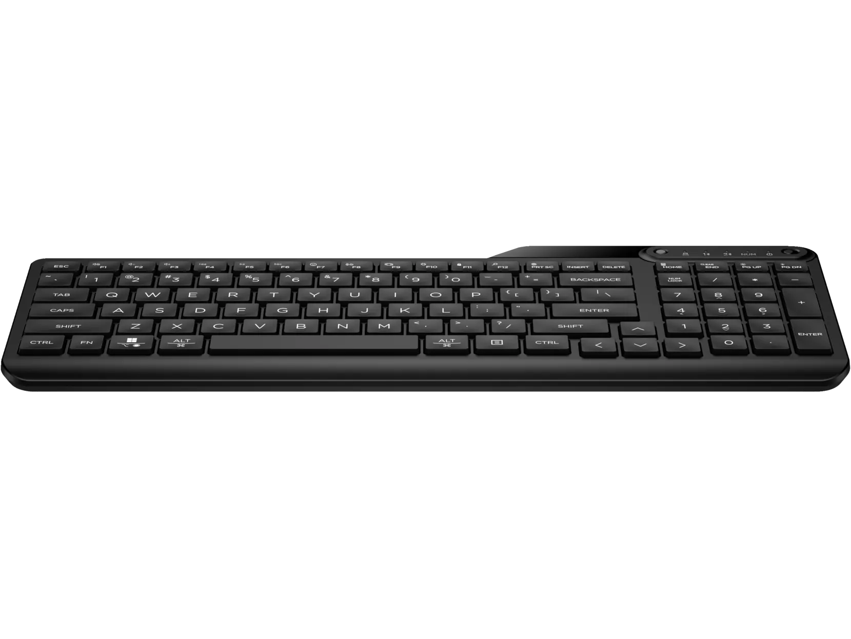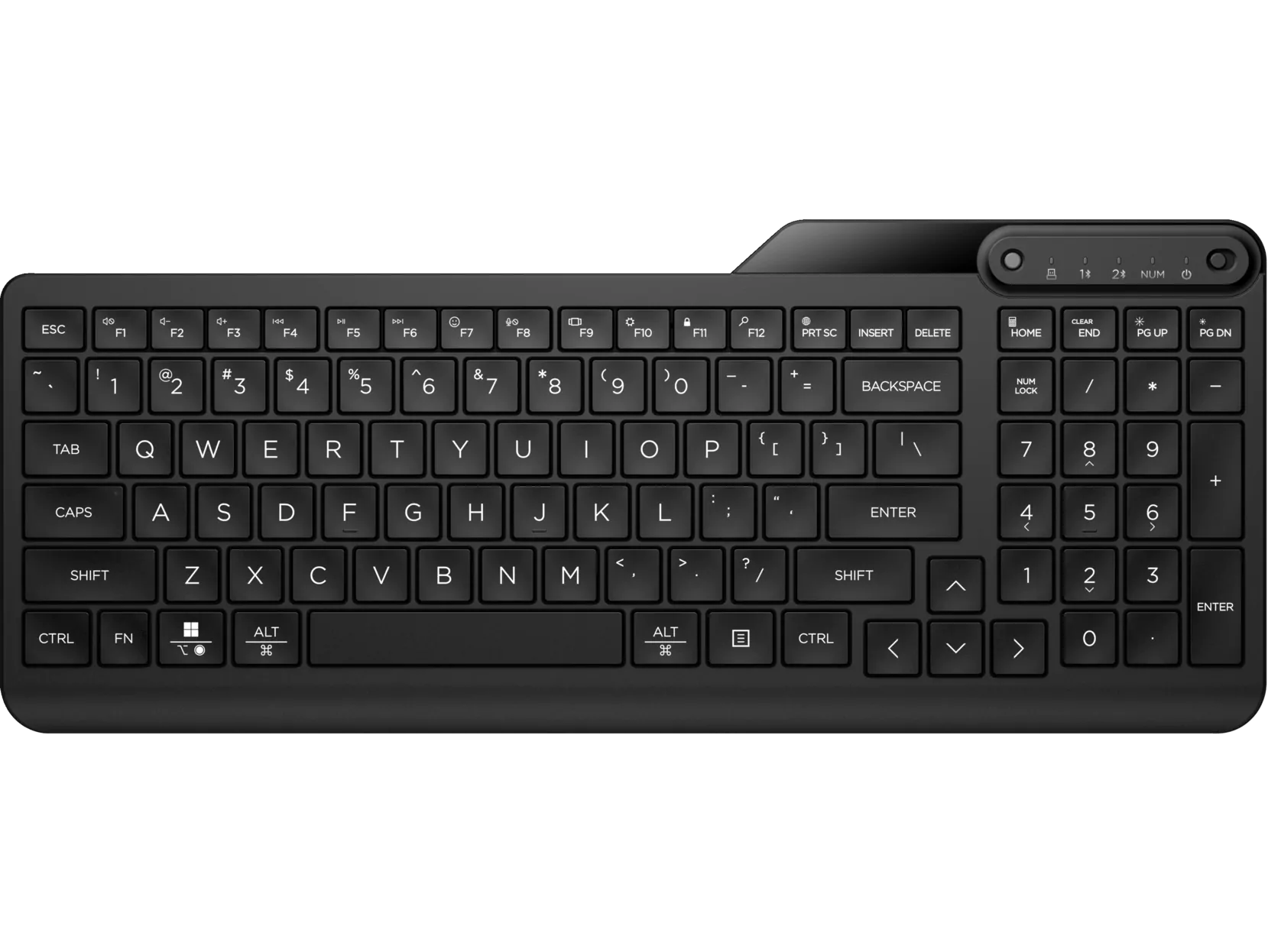 Teclado sem fios “dual-mode” da HP — funciona via Bluetooth e recetor USB, layout completo com bloco numérico, confortável e versátil.